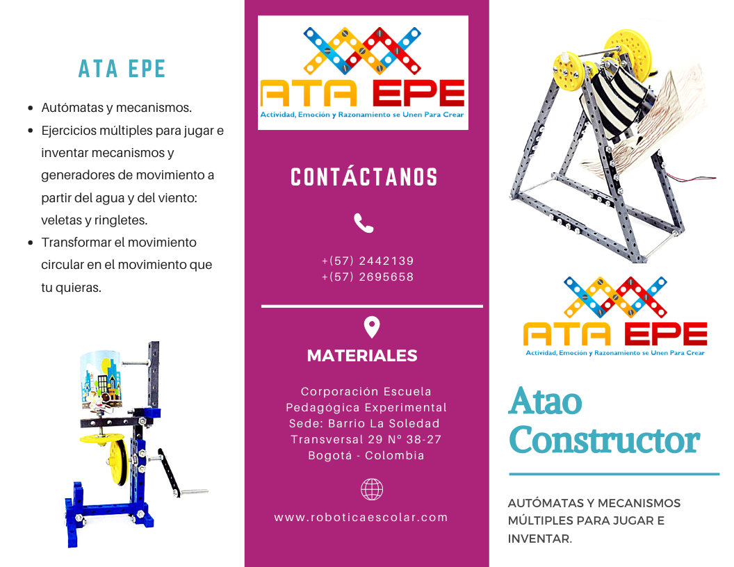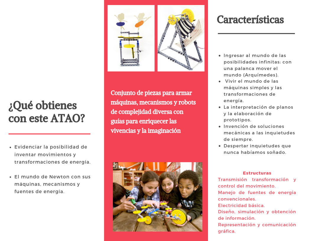 ATA Exporación es el inicio para inventar tu propio robot. A través de este ATAO evidencias la posibilidad de inventar movimientos y transformaciones de energía y el mundo de Newton con sus máquinas, mecanismos y fuentes de energía.