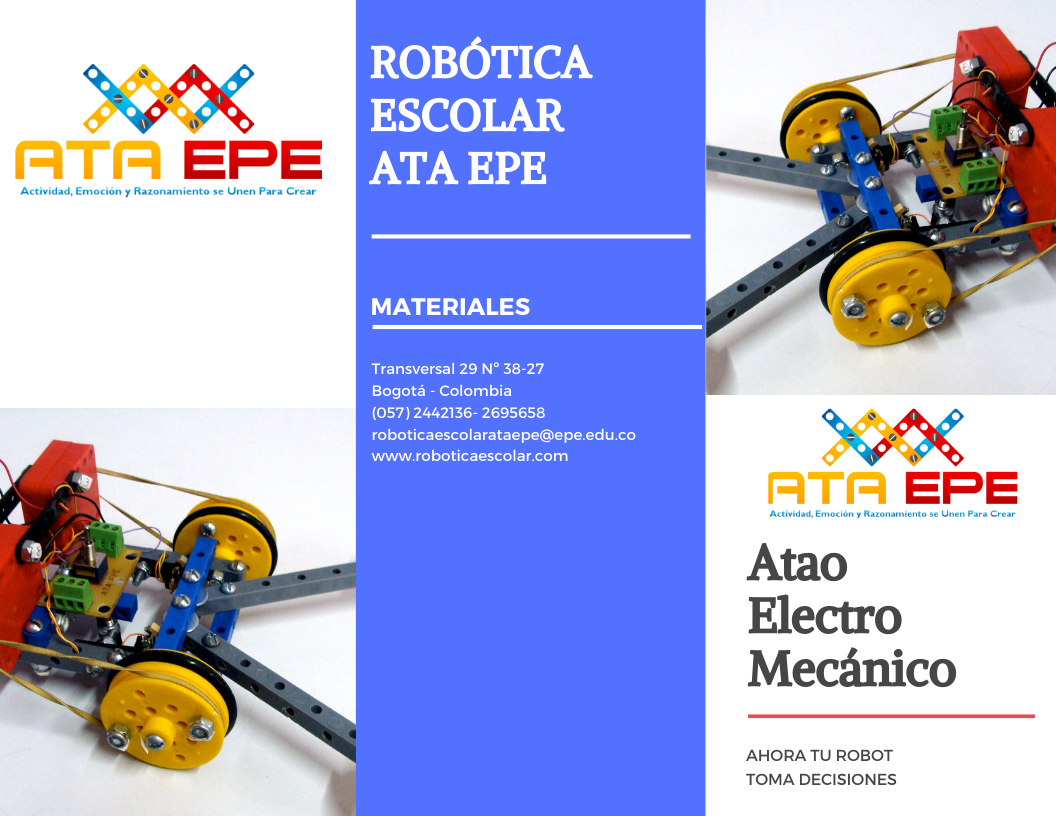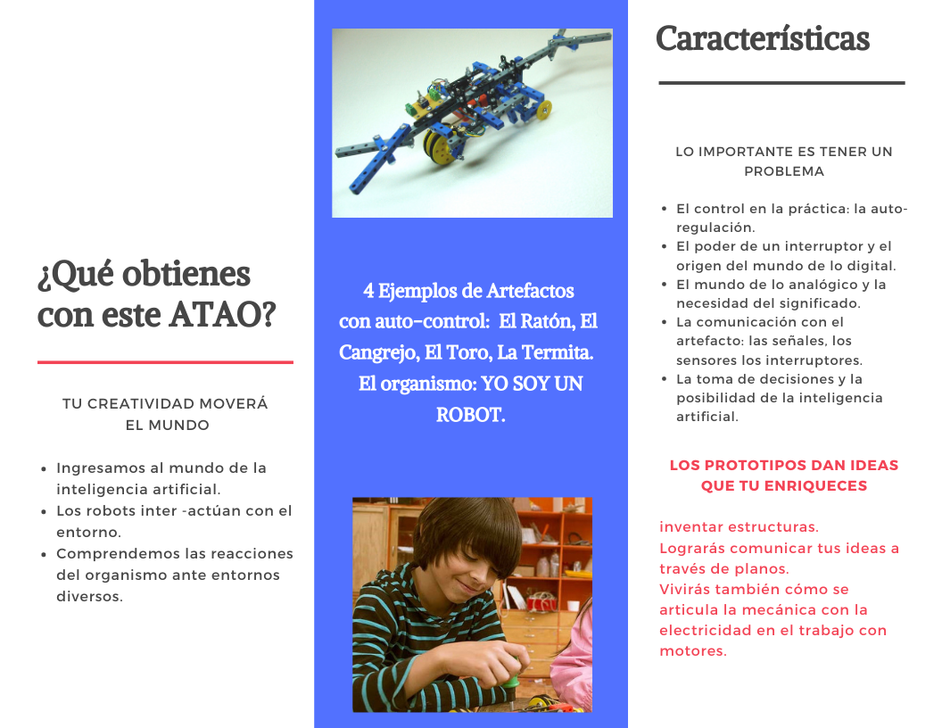 También puedes ingresar al mundo de la inteligencia artificial y ver cómo los robots inter -actúan con el entorno y comprender las reacciones del organismo ante entornos diversos. Cada ATAO ATA EPE tiene distintas características por ejemplo con el ATAO Exploración con los materiales puedes observar la transmisión transformación y control del movimiento, manejo de fuentes de energía convencionales, la electricidad básica, el diseño, simulación y obtención de información o la representación y comunicación gráfica.