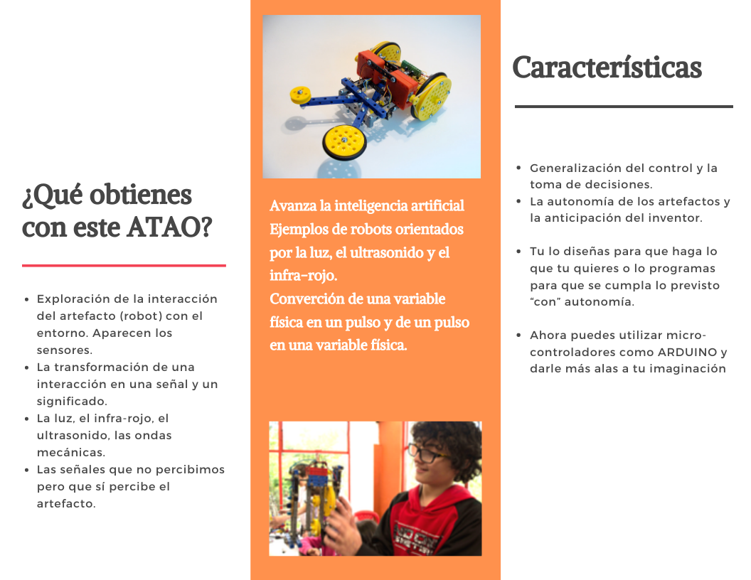 Con este ATAO obtienes la Exploración de la interacción del artefacto (robot) con el entorno. Aparecen los sensores, la transformación de una interacción en una señal y un significado, la luz, el infra-rojo, el ultrasonido, las ondas mecánicas o las señales que no percibimos pero que sí percibe el artefacto.