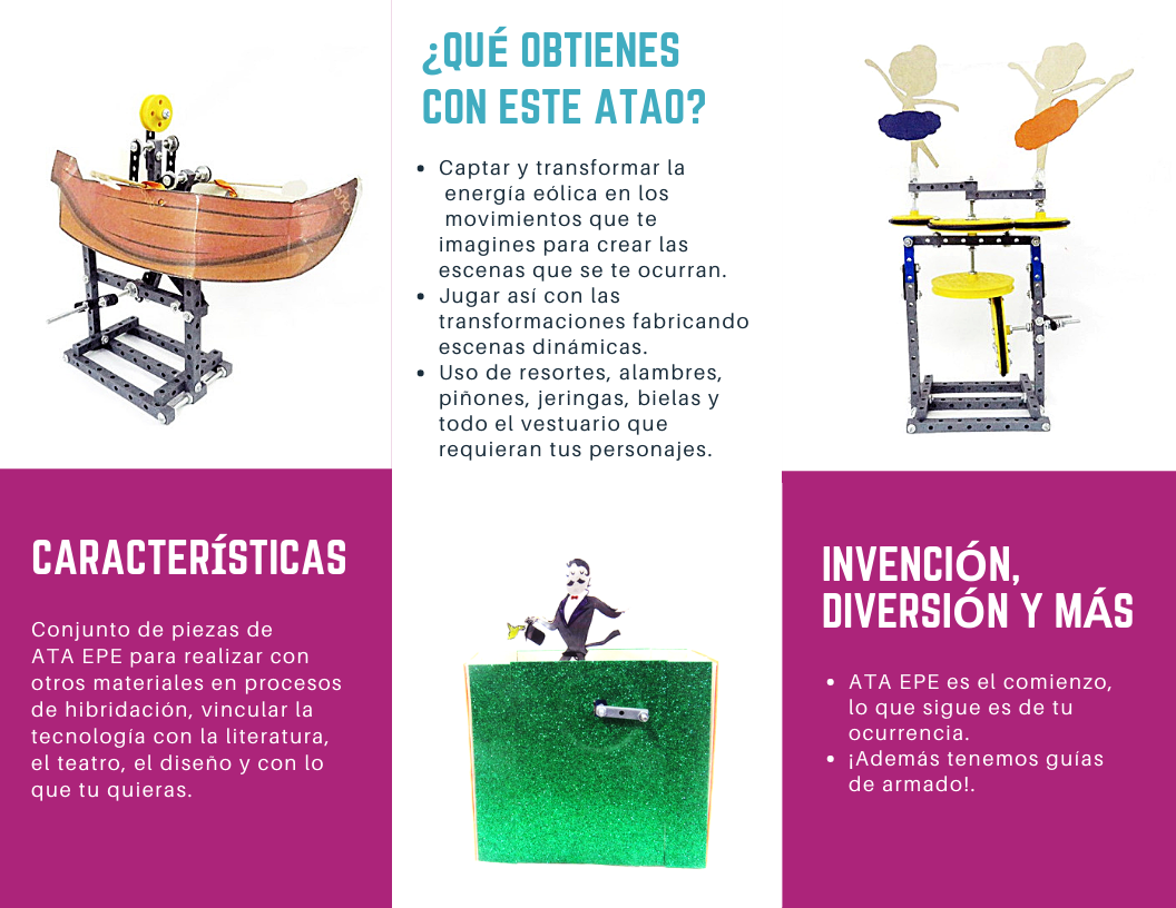 Este es un Conjunto de piezas de ATA EPE para realizar con otros materiales en procesos de hibridación, vincular la tecnología con la literatura, el teatro, el diseño y con lo que tu quieras. A través de este ATAO puedes adaptar y transformar la energía eólica en los movimientos que te imagines para crear las escenas que se te ocurran, jugar así con las transformaciones fabricando escenas dinámicas y usar resortes, alambres, piñones, jeringas, bielas y todo el vestuario que requieran tus personajes.